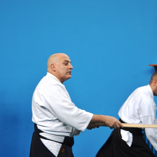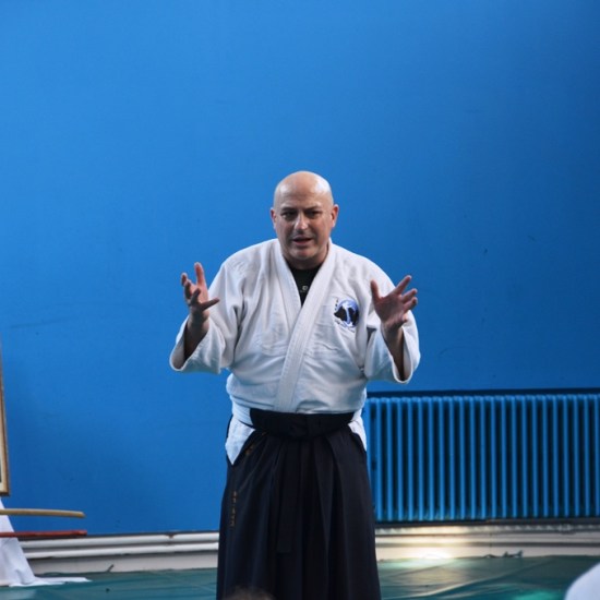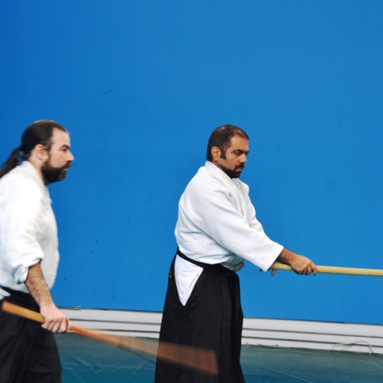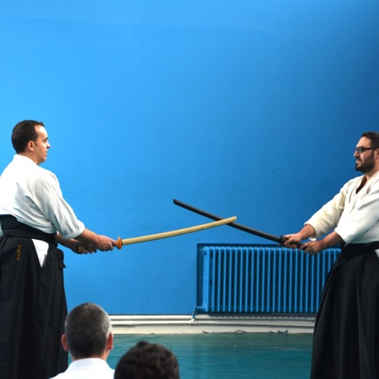 Marcos nos habla de los secretos del Aikido con el trabajo de bokken. “Cuando tiren de ti entra…. Cuando te empujen cede y gira”. Nos muestra un trabajo de bokken relacionado con las técnicas de Aikido con manos vacías y concluye con unas técnicas de bokken contra bokken.